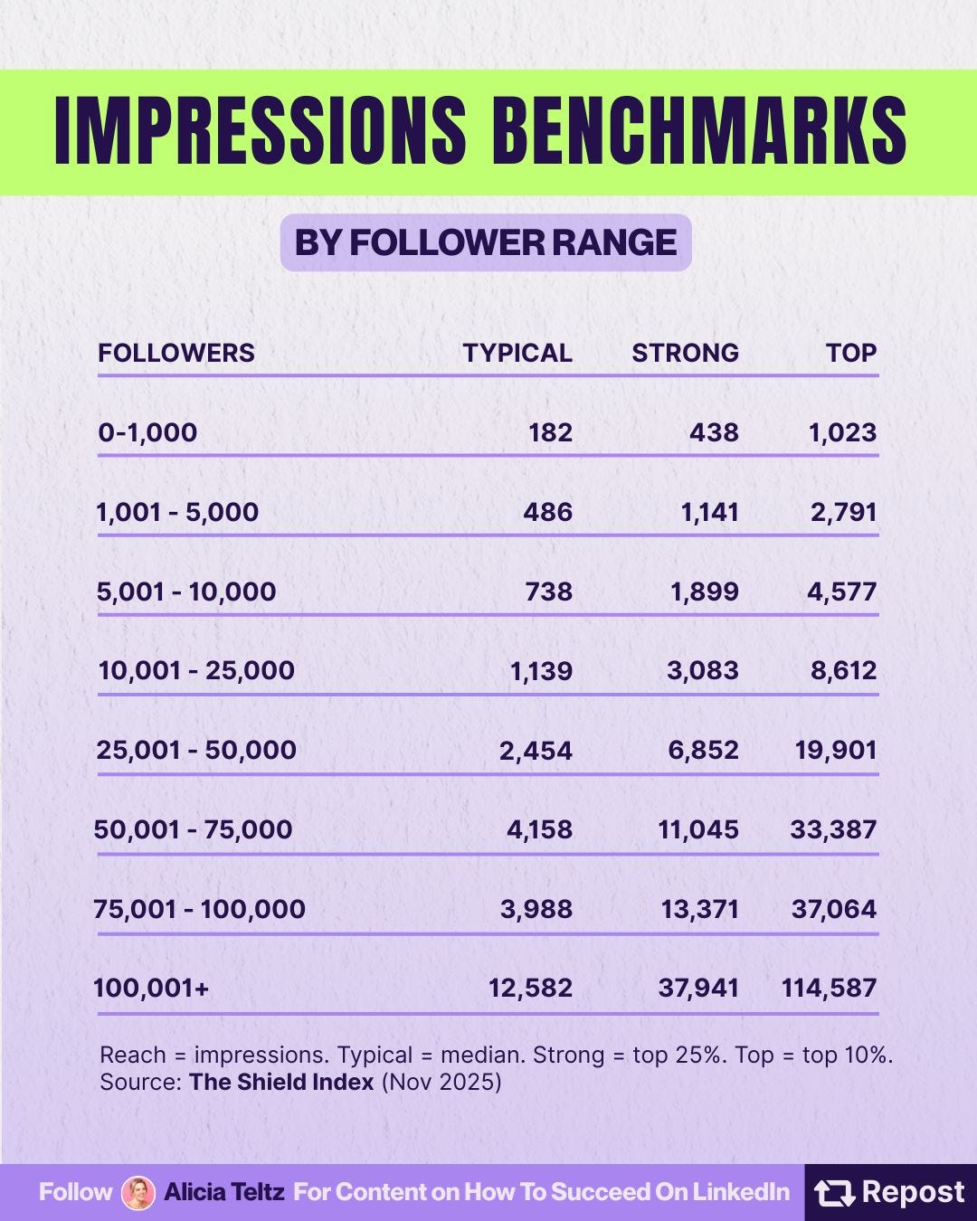 Thanks for this. The "impressions benchmarks by follower range" tracks well with my experience.